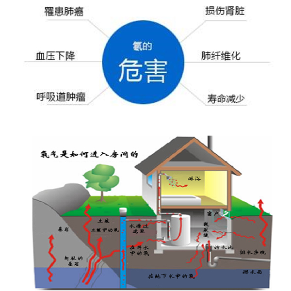 氡是鐳的衰變物,通過(guò)巖石縫隙釋放到地面,其初始狀態(tài)為氣體。但是經(jīng)過(guò)多次衰變后成為納米級(jí)的顆粒物,擴(kuò)散在空氣中,一旦被人吸入體內(nèi),通過(guò)肺泡進(jìn)入血液無(wú)法排出,就會(huì)在人體內(nèi)不斷衰變產(chǎn)生的射線及短壽命子體對(duì)人體健康造成危害且對(duì)肺部危害潛伏期長(zhǎng)達(dá)15年左右。是世界衛(wèi)生組織認(rèn)定的一類致癌物。