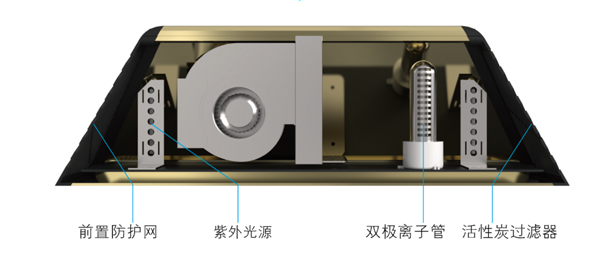 工作原理:本產(chǎn)品包含前置防護網(wǎng)、紫外光源、雙極離子管、活性炭過濾器。利用雙極離子和紫外線燈的協(xié)同作用,快速分解氣態(tài)污染物,去除異味,殺滅細菌。最后,由活性炭過濾器對殘留的氣態(tài)污染物及異味進行進一步去除。通風(fēng)面板采用傾斜設(shè)計,利于循環(huán)凈化。...