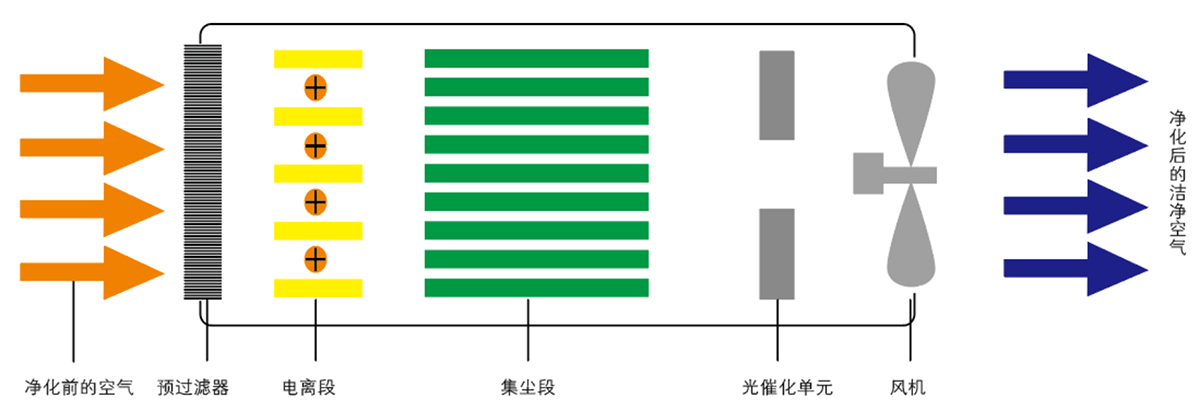 工作原理:本產(chǎn)品由進(jìn)風(fēng)口、預(yù)過(guò)濾器、兩段式高壓靜電場(chǎng)、風(fēng)機(jī)、光催化單元組成。預(yù)過(guò)濾系統(tǒng)首先對(duì)空氣中較粗的飄塵粉塵截流過(guò)濾,一般5—6微米左右的飄塵粉塵可通過(guò)預(yù)過(guò)濾系統(tǒng)完成。兩段式高壓靜電場(chǎng)具有最佳集塵效果和最大的集塵面積,當(dāng)污濁的空氣進(jìn)入電場(chǎng)極區(qū)時(shí),靜電場(chǎng)立即對(duì)空氣中飄塵粉塵、細(xì)菌、氣溶膠等雜質(zhì)進(jìn)行極化,使其帶上電荷,被極化后的污染物被集塵區(qū)的極片有效吸集。然后經(jīng)過(guò)光催化單元,通過(guò)本身具有殺菌力的特殊光源照射光催化材料結(jié)合空氣中的水和氧氣進(jìn)行光催化反應(yīng),快速產(chǎn)生高濃度的高級(jí)殺菌離子團(tuán),通過(guò)這些高級(jí)氧化粒子的氧化性和...