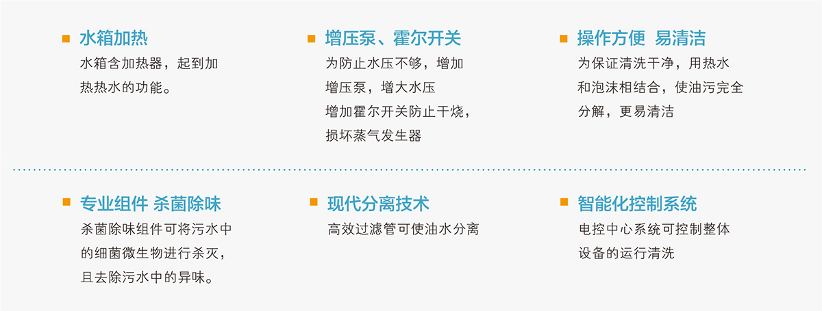 ■ 蒸汽發(fā)生器:因油煙中的油污經(jīng)過高溫后,粘連度較高,用常溫水很難清洗掉油污,所以用蒸汽發(fā)生器、把常溫水變成蒸汽和熱水進(jìn)行油污清洗。