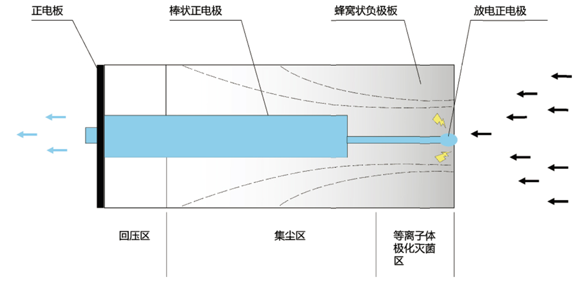 工作原理:蜂巢式高壓靜電殺菌除塵裝置必須制造出兩個(gè)電場,一個(gè)電場使空氣中塵埃荷電,稱為荷電電場;另一個(gè)電場使荷電塵粒分離收集,稱為分離電場。荷電場的放電極(金屬針)連接高壓直流電源的正極,分離電場的集塵極(蜂巢狀)接地為負(fù)極。接通電源以后,陰極和陽極之間就建立了一個(gè)非均勻的電場,陽極的周圍電場最大。當(dāng)放電極周圍的空氣全部電離后,產(chǎn)生了電暈。放電極(金屬針)電暈范圍通常只是周圍幾毫米處。由于電暈區(qū)的范圍很小,只有負(fù)離子進(jìn)入電暈內(nèi)區(qū),少量的塵粒在電暈內(nèi)區(qū)通過,獲得負(fù)電荷,沉積在電暈極上。正離子進(jìn)入電暈外區(qū),與電暈外區(qū)通...
